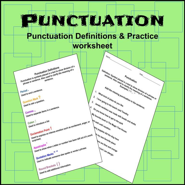 Punctuation printables include two worksheets. One page will show punctuation definitions. The second page is filling in the missing punctuation.